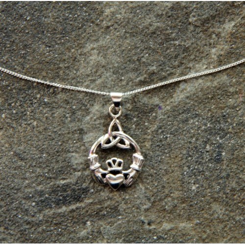 This is a beautiful Sterling Silver Claddagh Pendant complete with a trinity knot. The Claddagh is the symbol of Love and friendship, whilst the Trinity points to time, the past, the present and the future. This pendant comes complete with a 18" silver chain.
